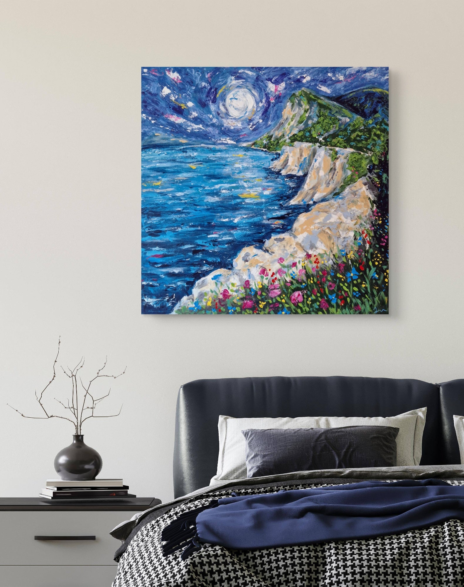 That dreamy moment we all crave - standing on a cliff, the world quiet, and the ocean glowing under a huge full moon. The sky is swirling, the water is alive with reflections, and wildflowers spill over the rocks like they’re celebrating the night.